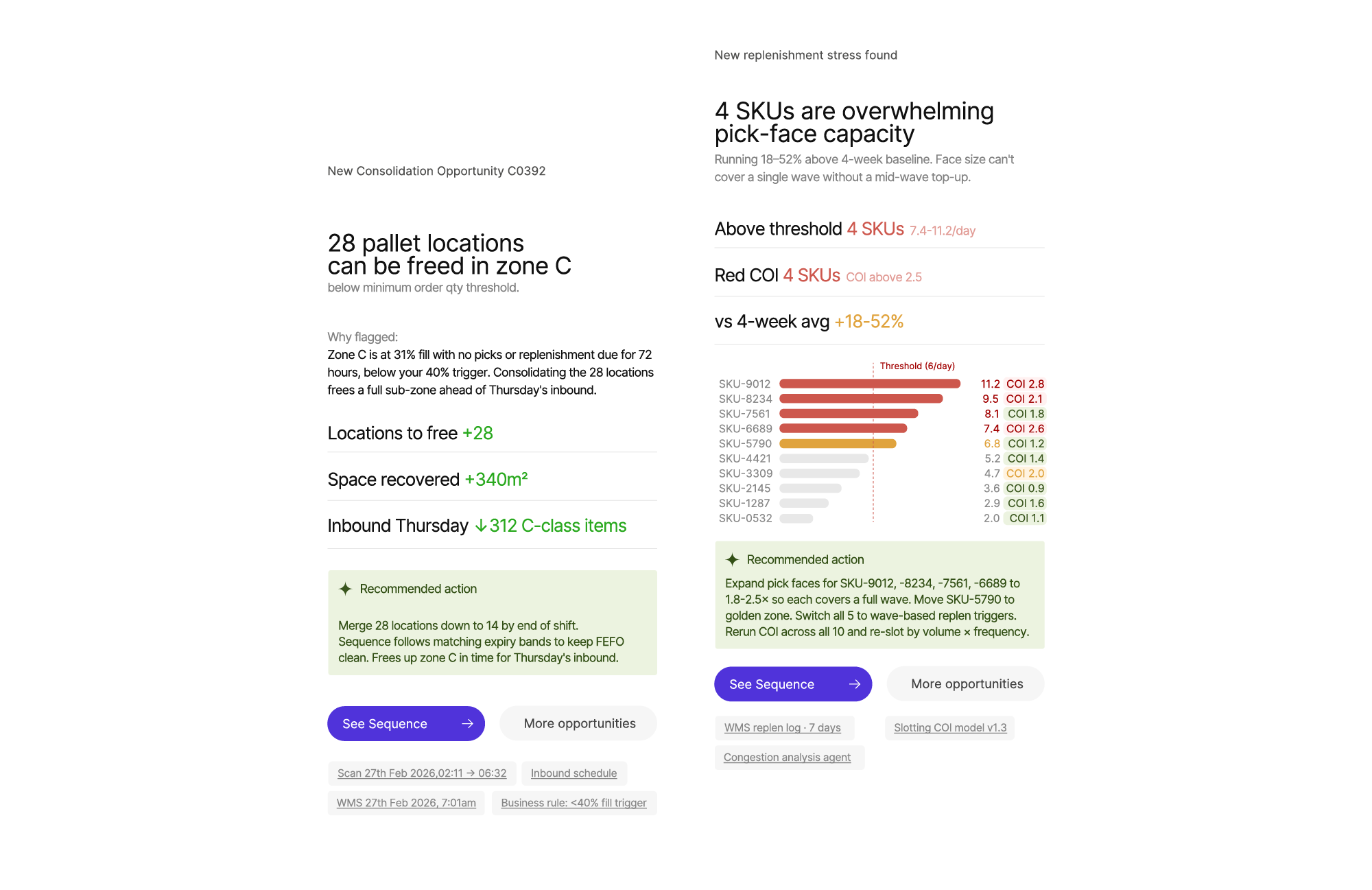 The system runs continuously across every shift, detecting emerging patterns, connecting signals across your WMS, operations, and physical reality, and flagging risks before they hit your KPIs.