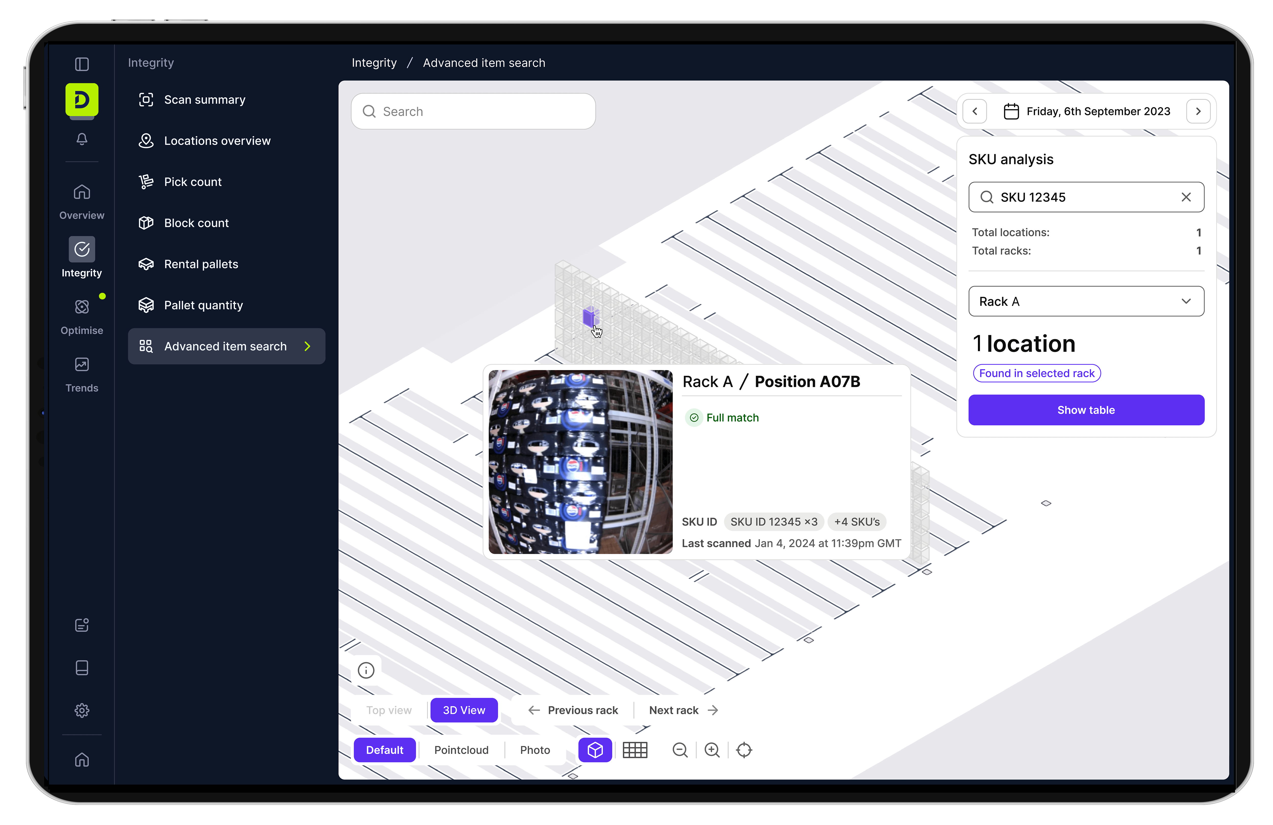 Say goodbye to time-consuming manual lookups or walking the floor to hunt down missing SKUs. DexoryView Integrity gives you a powerful search function that lets you locate any item in the warehouse by ID, batch, expiry date, product type, or storage condition.