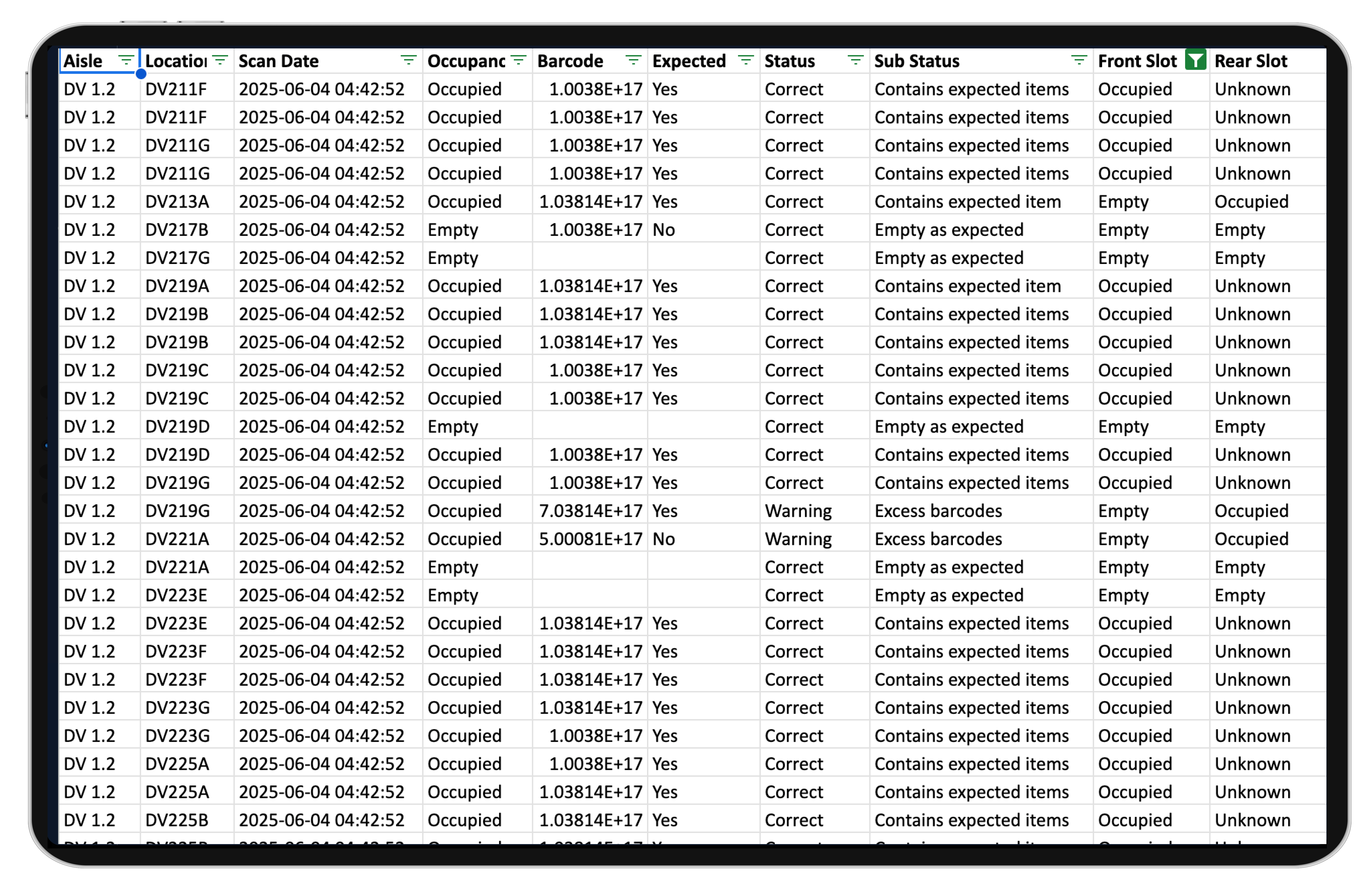 Our autonomous robots detect occupancy and capture barcodes across both front and rear pallet positions, with no pallet moves, no disruption. Using long-range vision and advanced LiDAR, DexoryView records and reports on every double deep location as a single logical unit, fully aligned with your WMS.