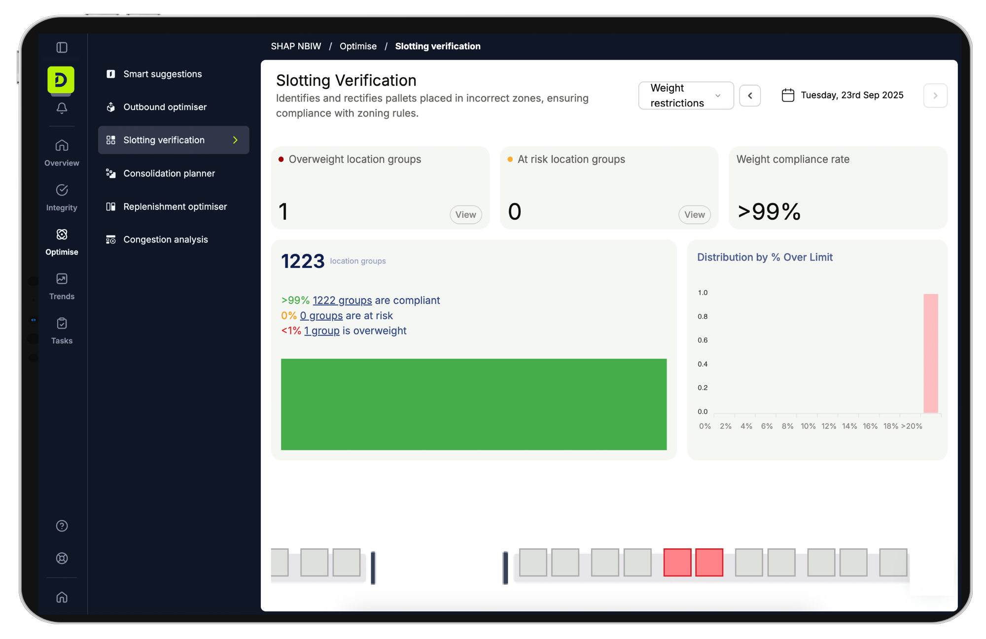 DexoryView Optimise’s Weight Restriction feature prevents that. Daily scans validate actual loads against your configured limits, showing you which locations are compliant, which are at risk, and which are already overweight.